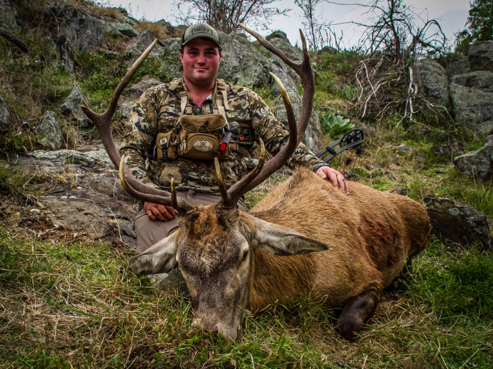 While glassing the hills we spotted two stags bedded on a peak. The wind was howling so I got in close and waited for them to stand up. I got an arrow in this stag from 25 metres and he was down after a 40 metre dash.”