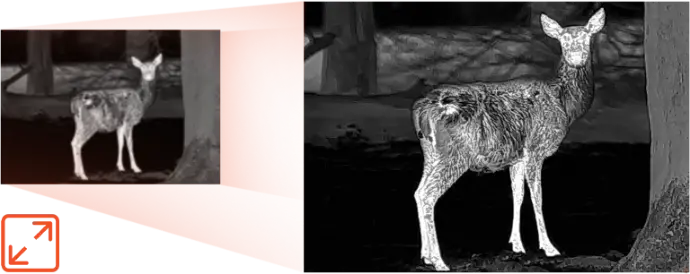 Combining base magnification with continuous digital zoom up to 14.8x, powered by Al-driven Thermal Super Resolution technology, it delivers ultra-detailed images with premium quality.