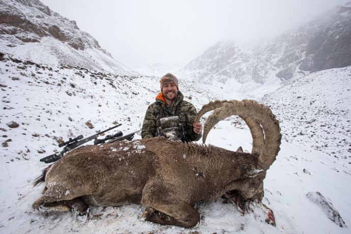 “Hunting on horseback for a week in the Tien Shan Mountains in Kyrgyzstan. Over 4500m looking for Mid-Asian Ibex, the physical exertion was something I've never experienced before. Success came on this 10 year old Billy using a blizzard to cover the distance between us.”