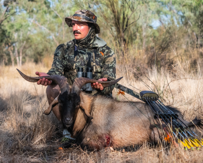 “I wanted to build some confidence with my recurve bow so I took it out west on a trip with Bailey. This billy goat was with a mob that was chasing a nanny that was on heat, so I snuck in to about eight metres and sent an arrow. I hunted some much bigger animals this year but this one marked me starting to commit to the recurve again properly and it was great to share the moment with my mate.”