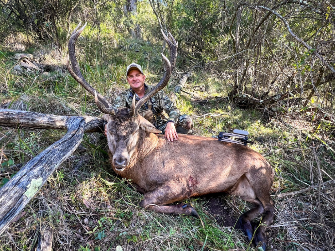 While glassing the hills we spotted two stags bedded on a peak. The wind was howling so I got in close and waited for them to stand up. I got an arrow in this stag from 25 metres and he was down after a 40 metre dash.”