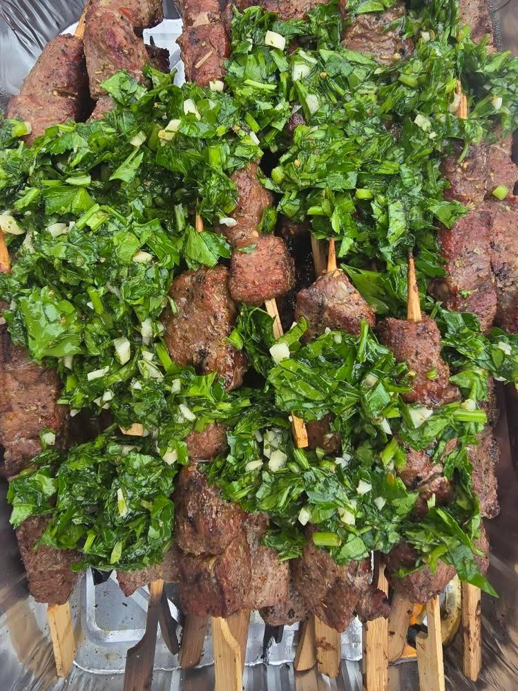 Once the skewers are off the grill, spoon the chimichurri generously over the hot meat. Let rest for a couple of minutes before serving.