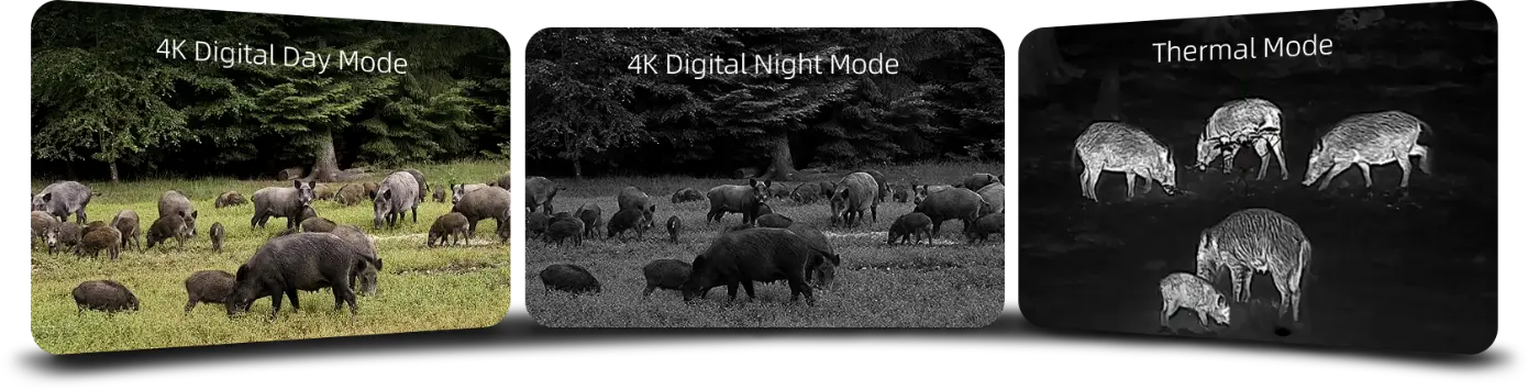 By integrating NETD <15 mK thermal sensitivity, a 4K Ultra CMOS sensor, dual band IR illumination, and precise laser rangefinder, it delivers versatile and high confidence imaging across daylight, twilight, and complete darkness, supporting reliable detection, identification, and distance awareness in complex terrain and demanding field scenarios.